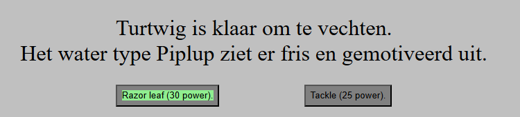 Voor de eindopdracht ervan heb ik een Pokemon fighter gemaakt. Ik heb een fighter gemaakt waarin je drie Pokemons kan kiezen en je tegenstander een van de andere Pokemons willekeurig kiest. Ik heb ook gecodeerd dat de tegenstander een willekeurige aanval doet. Als ik extra tijd hiervoor had gehad zou ik een betere healthbar creeëren, meer pokemons toevoegen en meer de pokemon types uitwerken.